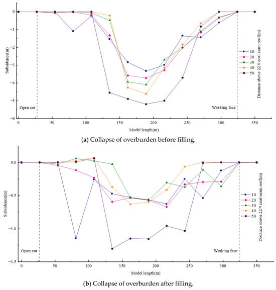 Vertical displacement of marker particles at varying elevations above upper- and lower-seam roofs was monitored pre- and post-mining. Figure 14 presents settlement curves for distinct overburden strata following lower-seam extraction. As shown in Figure 14a, post-mining settlement curves exhibit a concave profile with steep flanks. Proximal strata experienced deeper subsidence and more severe collapse, attenuating with increasing distance from the seam. Distant strata displayed reduced subsidence magnitude and spatial extent due to load-bearing effects from collapsed lower layers. Collapse completeness correlated inversely with vertical distance from the mined seam.
