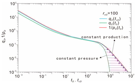As shown in Figure 2, the output solution qD of constant pressure production and the reciprocal 1/pD of the pressure solution of constant production are plotted on a graph. The two curves basically coincide in the unstable flow stage and are separated in the boundary control flow stage [16]. In order to make the two curves coincide in the boundary control flow stage, Blasingame applied the dimensionless matter equilibrium time tcD to replace the dimensionless time tD. The results show that the two curves coincide completely. Therefore, the introduction of tcD makes the variable production solution equivalent to the fixed production solution so that the Blasingame method can be applied to the two cases of variable production and variable bottom hole flow pressure [17,18].