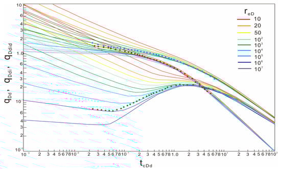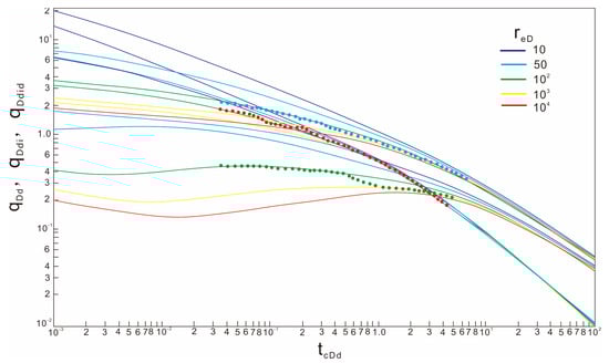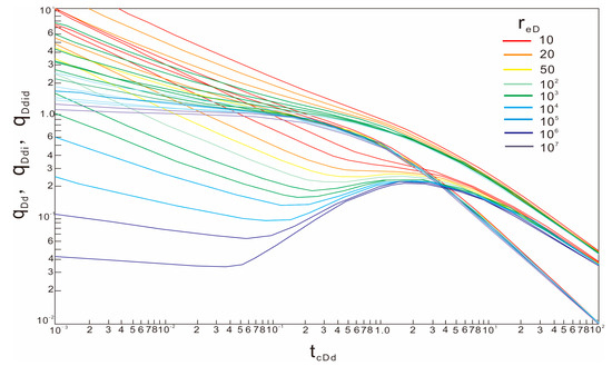 - The double logarithmic curves of q/∆pp, (q/∆pp)i, and (q/∆pp)id—tca are drawn in the rectangular coordinate system on the semi-transparent paper, and the drawn curves are fitted with the Blasingame typical chart curve (Figure 3) to obtain better curve-fitting results. According to the fitting results, the dimensionless well control radius reD is recorded.