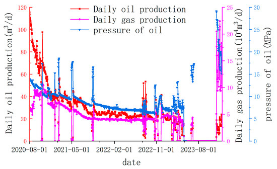 From the dynamic variation diagram of operating data of production from Well A, from August 2020 to August 2021, the daily oil production decreased sharply, and the daily gas production and oil pressure decreased steadily. From August 2021 to May 2023, oil pressure, daily gas production, and daily oil production basically stabilized.