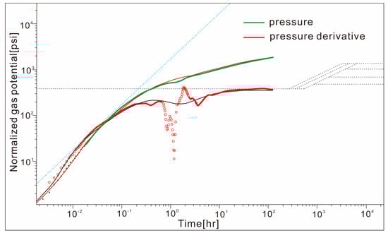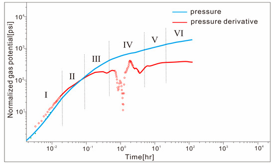 In order to consider the change in gas PVT properties with pressure in the depletion development of gas reservoirs, the normalized pseudo−pressure and pseudo−time are introduced to analyze the well test. The pseudo−pressure simplifies the well−test interpretation process by linearizing the nonlinear gas flow problem [19].