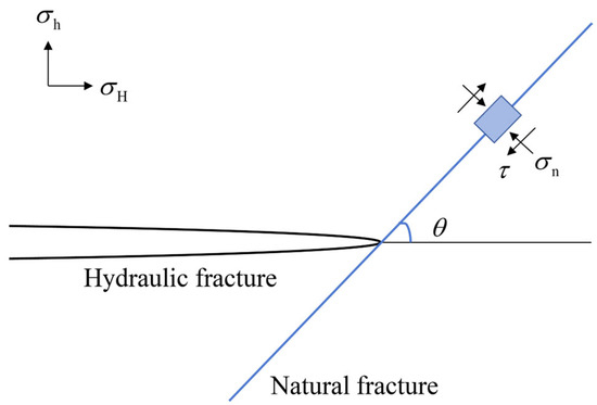 When a hydraulic fracture propagates along its path and intersects a natural fracture, the approach angle between the hydraulic fracture and the natural fracture is denoted as θ. The interaction is governed by the maximum horizontal principal stress (σH) and the minimum horizontal principal stress (σh). A two-dimensional interaction model illustrating this scenario is presented in Figure 2.