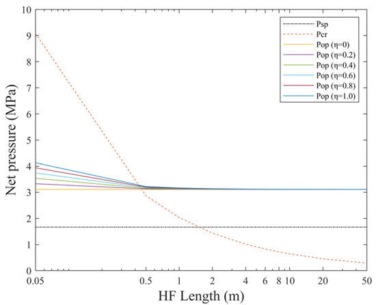 Figure 3 illustrates the influence of hydraulic fracture length on interaction behaviors. The results demonstrate that hydraulic fracture length exhibits no correlation with the critical pressure required for natural fracture slip. As hydraulic fracture length increases, the critical crossing pressure required for hydraulic fracture crossing through natural fractures progressively decreases, making crossing states more favorable. When hydraulic fracture length is less than 0.5 m, the fluid pressure difference required to satisfy opening conditions under varying η values becomes increasingly pronounced. Conversely, for hydraulic fracture lengths exceeding 0.5 m, variations in η exhibit negligible effects on the minimum fluid pressure required for opening conditions.