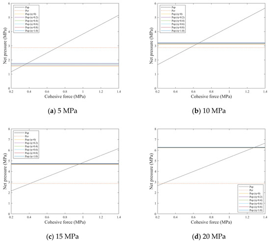 Figure 5 illustrates the influence of horizontal stress differences and cohesion of natural fractures on interaction behaviors. The results demonstrate that the critical hydraulic fracture crossing pressure shows no dependence on either horizontal stress difference or cohesion, whereas the critical natural fracture opening pressure maintains independence from cohesion but exhibits a positive correlation with horizontal stress difference. With increasing horizontal stress difference and cohesion, the critical natural fracture slip pressure progressively rises, making fracture slip more difficult to initiate. As horizontal stress difference increases, the influence of η variation on the critical fluid pressure for natural fracture opening gradually diminishes, while cohesion changes show negligible effects on η.
