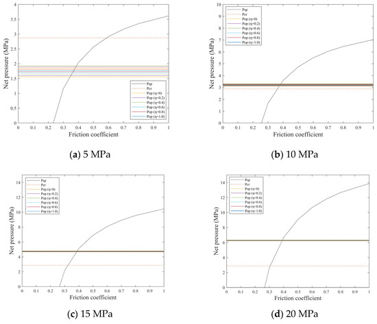 Similar to the cohesion effect, the friction coefficient exhibits distinct threshold effects on interaction behaviors under varying horizontal stress difference conditions. Under low horizontal stress difference (≤5 MPa), two friction coefficient thresholds emerge. Taking a 5 MPa stress difference as an example, threshold effects occur at friction coefficients of 0.35 and 0.58. When the friction coefficient is less than 0.35, the interaction sequence progresses from natural fracture slip to opening, followed by hydraulic fracture crossing as net pressure increases. For friction coefficients between 0.35 and 0.58, natural fractures first open, subsequently slip, and finally experience hydraulic fracture crossing. When the friction coefficient exceeds 0.58, natural fractures open initially, followed directly by hydraulic fracture crossing. Under high horizontal stress difference conditions (≥10 MPa), only a single friction coefficient threshold exists. Below this threshold, natural fracture slip precedes hydraulic fracture crossing after reaching critical crossing pressure. Above the threshold, hydraulic fractures penetrate directly upon achieving critical pressure. Increasing natural fracture friction coefficients universally promotes hydraulic fracture crossing through natural fractures. Horizontal stress difference governs both the sequence of interaction behaviors and the magnitude of friction coefficient thresholds.