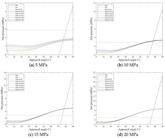 Figure 7 illustrates the influence of horizontal stress difference and approach angle on interaction behaviors. The results demonstrate that the critical crossing pressure of hydraulic fractures crossing through natural fractures remains independent of both horizontal stress difference and approach angle. With increasing approach angle, the critical opening pressure of natural fractures gradually rises, while the influence of η on this critical opening pressure diminishes progressively. When the approach angle exceeds 70°, the critical slip pressure of natural fractures increases linearly with the approach angle, and its growth rate accelerates with a higher horizontal stress difference. Increasing horizontal stress difference elevates both the critical opening and slip pressures of natural fractures, amplifies the impact of approach angle on these critical pressures, and reduces η’s influence on the critical opening pressure.