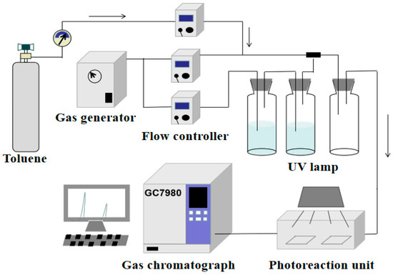 The photocatalytic activity was evaluated by real-time monitoring of ppm-level toluene concentration in the reactor using an online gas chromatograph (GC7980), as shown in Figure 1. First, 50 mg of each sample was weighed and uniformly dispersed on two rectangular quartz glass plates (40 mm × 100 mm) using anhydrous ethanol. The samples were dried in a 60 °C constant-temperature drying oven, then stored in a light-protected environment to cool to room temperature. Subsequently, the samples were placed in a rectangular reactor with a volume of 0.726 L (22 cm × 11 cm × 3 cm). The reactor was sealed by covering it with a quartz glass plate and tightening the screws. A 125 W mercury lamp was vertically positioned 11 cm above the reactor as the light source for photocatalytic reactions. Toluene gas was obtained from a compressed gas cylinder at an initial concentration of 1000 ppm. Dry air and humid air were generated by introducing air from an air generator into two separate gas bottles. The toluene was diluted to 50 ppm by adjusting the flow rates of different gas lines. The diluted toluene was introduced into the reactor, and after achieving adsorption-desorption equilibrium, the UV lamp was turned on for continuous monitoring over 30 min. The purification rate of toluene was shown as follows: