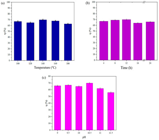Effect of process parameters on photocatalytic activity of SrSn(OH)6. (a) Effect of reaction temperatures: reaction time was 8 h, and pH of precursor solution was 9.5; (b) Effect of reaction time: reaction temperature was 140 °C, and pH of precursor solution was 9.5; (c) Effect of pH of precursor solution: reaction temperature was 140 °C, and reaction time was 12 h.