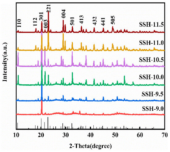 The phase and crystal structures of samples prepared with precursor solutions at different pH values were characterized by XRD, as shown in Figure 3. It can be observed that the diffraction peaks of the SSH-10.5 sample matched well with the standard XRD pattern of SrSn(OH)6 (JCPDS No. 09-0086). The diffraction peaks at 10.8°, 17.9°, 20.1°, 21.5°, 22.9°, and 28.9° correspond to the (110), (112), (301), (003), (221), and (004) crystallographic planes, respectively [19]. At high pH values, it was observed that some peaks would appear in the sample, which affected the purity of the catalyst. Based on the Scherrer equation (Equation (2)), the crystallite sizes along different crystallographic directions were calculated, and the results are summarized in Table 1. Adjustment of the pH of the precursor solution influenced the crystallite sizes along specific crystallographic planes [20]. The SSH-10.5 sample had the biggest crystallite size, which could reduce grain boundary defects, inhibit electron-hole recombination, and enhance stability.