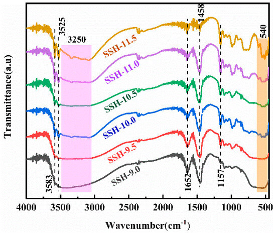 The variations in specific surface area and pore structure of the samples can be observed from Table 2. The specific surface area and total pore volume of the catalysts significantly increased with decreasing pH values. When pH ≤ 9.5, the samples exhibited much larger specific surface areas compared to others, which can be attributed to their poorer crystallinity caused by excessively low pH conditions. The specific surface area of SSH-10.5 (48.91 m2·g−1) was approximately 6.3 times greater than that of SSH-11.5 (7.80 m2·g−1). Morphological analysis revealed that the rod-shaped SSH-10.5 possessed a porous structure, while SSH-11.5 showed spherical aggregates composed of numerous fibrous rods, explaining the superior surface area of SSH-10.5. This phenomenon further demonstrates the significant influence of the precursor solution pH on the crystalline structure of the samples. Concurrently, the pore volume increased from 0.09 cm3·g−1 to 0.39 cm3·g−1. This enhanced pore volume facilitates the diffusion of target pollutant molecules, intermediate products, and final product molecules during catalytic processes.