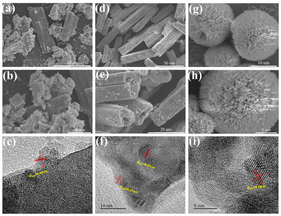 SEM images of prepared materials: (a,b) SSH-9.5; (d,e) SSH-10.5; and (g,h) SSH-11.5 samples; TEM and HRTEM images of prepared materials: (c) SSH-9.5; (f) SSH-10.5; and (i) SSH-11.5.