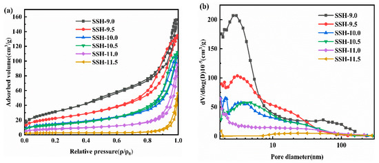 Figure 6a,b show the N2 adsorption-desorption isotherms and pore size distribution (PSD) plots of the samples prepared with precursor solutions at different pH values, which were used to study the specific surface area and pore structure of the catalysts. Generally, pores with diameters > 50 nm are classified as macropores, those between 2–50 nm as mesopores, and those <2 nm as micropores [23]. As shown in Figure 6a, the N2 adsorption-desorption isotherms of all catalysts correspond to Type IV isotherms (IUPAC classification) with mesoporous capillary condensation, accompanied by distinct H3-type hysteresis loops (IUPAC classification), indicating the presence of abundant mesoporous structures in the samples. From Figure 6b, it can be seen that the pore sizes of all samples are predominantly distributed within the mesoporous range (2–50 nm), with SSH-9.0 exhibiting a small fraction of macropores. Notably, the samples prepared at pH 9.5 and 9.0 show distinct peak elevation in their PSD curves, likely due to the influence of lower pH values on the crystallinity of the catalysts.