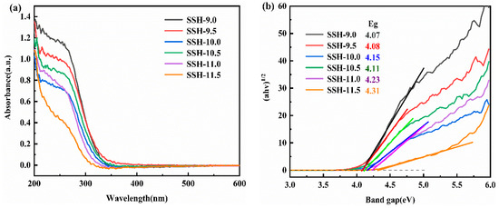 Figure 7a shows the UV–Vis diffuse reflectance spectra of SrSn(OH)6 synthesized from precursor solutions with different pH values. As observed, all samples exhibited strong absorption in the ultraviolet region (λ < 400 nm) with steep edges, which can be attributed to the bandgap transition of electrons from the valence band to the conduction band in SrSn(OH)6 [24]. The samples displayed negligible absorption in the visible light region, a phenomenon caused by the oxygen coordination environment. The energy required for charge transfer transitions from oxygen ions (O2−) to metal centers in hydroxides (e.g., In(OH)3, GaOOH) is higher than that in corresponding oxides, leading to absorption bands typically localized in the ultraviolet region [25]. As the pH decreases, the absorption edges of the samples show a distinct redshift, accompanied by an expanded ultraviolet absorption range. Notably, SSH-11.5 exhibited significantly lower absorption capacity in the deep ultraviolet region, likely due to structural modifications in the SrSn(OH)6 crystal. By plotting (αhv)1/2 versus photon energy (hv) using the empirical formula, the bandgap values of the samples were determined, as shown in Figure 7b. The calculated bandgap energies for SSH-11.5, SSH-10.5, and SSH-9.5 were 4.31 eV, 4.11 eV, and 4.08 eV, respectively. These results indicate that pH regulation effectively reduces the energy required for electron transitions and enhances the utilization efficiency of ultraviolet light in the samples [26,27,28].