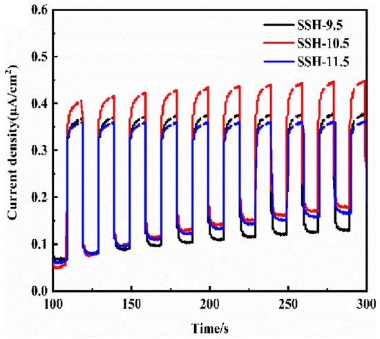 To investigate the carrier migration and separation behavior in the samples, photocurrent tests were performed on SSH-9.5, SSH-10.5, and SSH-11.5, as shown in Figure 8. Both SSH-9.5 and SSH-10.5 exhibited higher photocurrent densities compared to SSH-11.5, likely due to their enhanced light absorption properties. Notably, the photocurrent density of SSH-10.5 surpassed that of SSH-9.5, a phenomenon potentially related to their morphological differences. The dense block-like structure of SSH-9.5 may hinder carrier migration and transformation, whereas the rod-like SSH-10.5, with its regular surface and abundant small pores, facilitates improved migration and separation efficiency of photogenerated electron-hole pairs. A higher photocurrent intensity indicates a greater number of photogenerated electrons generated under light irradiation, correlating with superior photocatalytic performance. Therefore, SSH-10.5 demonstrated the highest photocurrent density, suggesting the presence of the largest quantity of photoinduced charges participating in the photocatalytic reaction [29]. Additionally, all samples exhibited reversible and reproducible transient photocurrent responses during repeated on/off irradiation cycles, indicating their robust photoelectrochemical stability.