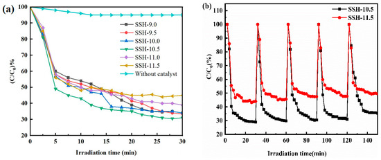 Degradation efficiency of toluene (a); and degradation stability test of the SSH-10.5 and SSH-11.5 samples (b).