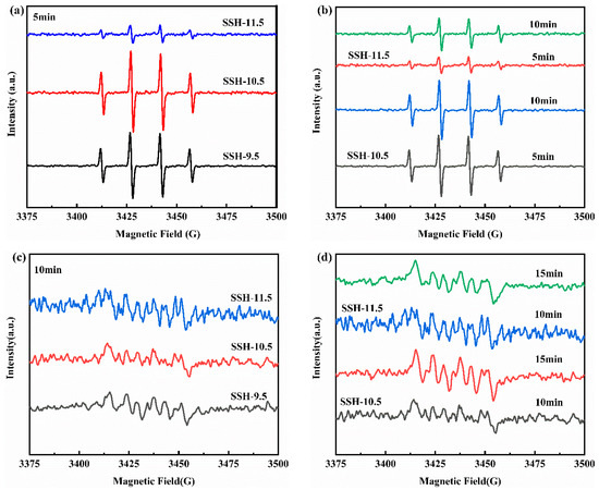 To investigate the photocatalytic reaction mechanism, electron spin resonance spectroscopy was employed using 5,5-dimethyl-1-pyrroline-N-oxide (DMPO) as a spin-trapping agent to monitor the generation and evolution of hydroxyl radicals (•OH) and superoxide radicals (•O2−) under irradiation [31]. Figure 10 displays the active radical trapping spectra, which are closely related to photocatalytic efficiency. Under light irradiation, SSH-9.5, SSH-10.5, and SSH-11.5 all exhibited characteristic Lorentzian signal peaks for •OH and •O2−, confirming the production of these active species during the photocatalytic reaction. However, the signal intensities of both radicals for SSH-9.5 and SSH-10.5 were significantly stronger than those for SSH-11.5, indicating that SSH-9.5 and SSH-10.5 generate more •OH and •O2−. This difference arises from their superior light absorption, narrower bandgap, and enhanced electron transport capabilities compared to SSH-11.5. Notably, SSH-10.5 produced slightly more •OH than SSH-9.5, which can be attributed to its morphology favoring photogenerated carrier migration, consistent with the observed trends in toluene degradation [32]. The radical signal intensities gradually increased with prolonged irradiation time. Interestingly, detectable •O2− signals in the trapping agent only emerged after 10 min of irradiation, and their intensities remained weak, suggesting that •O2− radicals are not the dominant active species in this photocatalytic process.