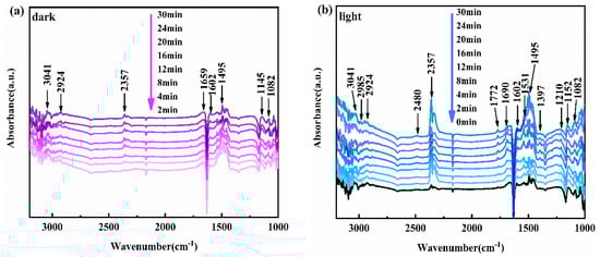 In situ infrared spectra of toluene degradation using SSH-10.5 under dark conditions (a) and ultraviolet light (b).