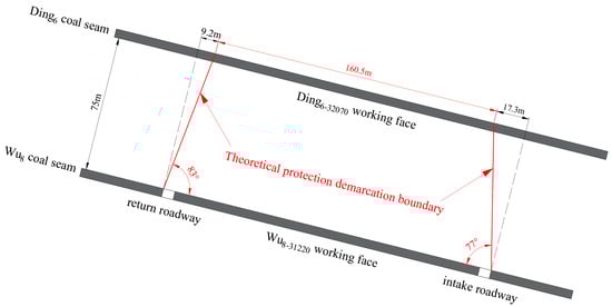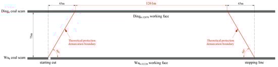 A strategically implemented 3-month interval between the cessation of the Wu8-31220 working face and the initiation of Ding6-32070 face mining creates an optimized pressure-relief temporal window. This temporal coordination ensures sufficient pressure relief in Ding6 seam. The strike pressure relief angle of the Wu8 working face is thus determined as 60° through comprehensive evaluation. Theoretical investigations demonstrate a precisely maintained 43 m inward offset between the Ding6-32070 protection zone and both the initiation/termination boundaries of the Wu8 working face, as shown in Figure 2.