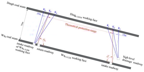 To quantitatively characterize the pressure relief domains along both ventilation flanks of the Ding6 coal seam following Wu8 seam extraction, a systematic monitoring protocol was implemented. Three diagnostic boreholes were strategically positioned in the high-level drainage roadway of the Wu8-31220 and Wu8-31200 intake roadway, respectively. These boreholes were aligned perpendicular to the demarcation boundary of the Ding6-32070 protective coverage zone with 15 m bilateral extensions, establishing a comprehensive pressure monitoring matrix. The geometrically optimized borehole array configuration is explicitly detailed in Figure 3.