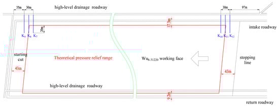 - In the dip direction, the pressure relief angle of the Wu8 coal seam on the intake roadway side is 77°, and the pressure relief range of the Ding6 coal seam is staggered inward by 17.3 m from the intake roadway. On the return roadway side, the pressure relief angle is 83°, and the pressure relief range of the Ding6 coal seam is staggered inward by 9.2 m from the return roadway. In the horizontal direction, the horizontal pressure relief angles of the Wu8 coal seam on the starting cut and the stopping line are both 60°, and the pressure relief range of the Ding6 coal seam is staggered inward by 43 m from both the starting cut and the stopping line. These precise pressure relief ranges and angle data provide an important theoretical basis for optimizing protective layer mining design and rationally arranging gas extraction boreholes. This methodology effectively resolves the spatial–temporal coordination challenges between gas extraction efficiency and operational safety in deep protective layer mining operations.