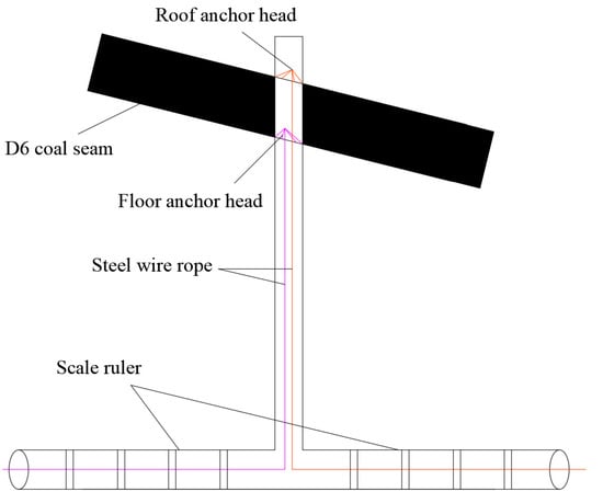 The expansion deformation monitoring system employed the high-precision LBY-3A stratigraphic displacement monitor, which features a maximum range of 200 mm and a display resolution of 1 mm. This dual-anchor instrumentation comprises the following: (1) a roof anchor head securely embedded within the Ding6 coal seam’s upper lithological boundary, and (2) a corresponding floor anchor head embedded within the seam’s basal stratum. Through the real-time tracking of differential displacement between these geomechanical reference points, the system enables the continuous quantification of coal seam deformation parameters. A schematic representation of this monitoring methodology’s operational framework is presented in Figure 6.