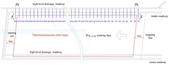 The borehole array was strategically designed in the Wu8-31220 intake airway’s high-level drainage roadway, comprising 58 cross-strata boreholes penetrating into the Ding6 protected seam. The layout diagram of gas extraction boreholes for the depressurized Ding6-32070 working face is depicted in Figure 7. All borehole endpoints are positioned 15 m inside the boundary line of the Ding6 coal seam’s intake roadway side, with a spacing of 20 m between boreholes. The boreholes have a depth of 72.25 m and a dip angle of 51°. The 1#–40# boreholes are designated as the first extraction unit, while the 41#–58# boreholes form the second extraction unit. The first extraction unit commenced networked extraction on 23 October 2023, whereas the second extraction unit initiated networked extraction earlier on September 5 of the same year. This extraction operation aims to fully utilize the influence of Wu8 coal seam mining on the Ding6 coal seam, achieving pressure relief gas extraction from the distant protected Ding6 coal seam layer.