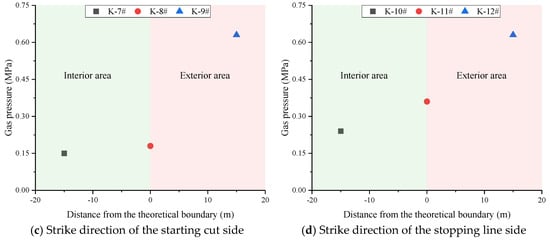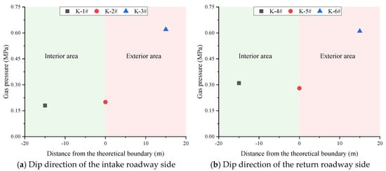 The gas pressure test results of the Ding6-32070 working face are shown in Figure 8. Along the dip direction, intake airway measurements demonstrate a progressive pressure reduction from 0.62 MPa at 15 m extra-boundary positions to 0.20 MPa at boundary interface and 0.18 MPa intra-boundary, while return airway counterparts record 0.61 MPa (extra-boundary), 0.28 MPa (boundary), and 0.31 MPa (intra-boundary). Strike direction measurements show similar patterns, e.g., the starting cut areas exhibit 0.63 MPa extra-boundary pressure decreasing to 0.18 MPa at boundary and 0.15 MPa internally, whereas stopping line zones maintain 0.63 MPa extra-boundary with sequential reductions to 0.36 MPa (boundary) and 0.24 MPa (intra-boundary). These measurements confirm the defined boundary’s effectiveness as a pressure discontinuity, with extra-boundary pressures maintaining near-original reservoir levels (0.61–0.63 MPa) versus significantly reduced intra-boundary values (0.15–0.36 MPa), demonstrating differential pressure relief responses across directional orientations.