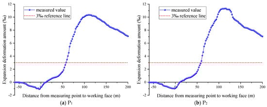From the figure, it can be observed that during the advance of the working face, the Ding6 coal seam undergoes a process of first compression and then expansion, which is related to the distribution of support pressure along the strike direction of the working face [,]. As the working face approaches the test point, the coal seam begins to be compressed at a distance of 50 m (−50 m) from the test point. Subsequently, as the distance to the test point gradually decreases, the coal seam continues to be further compressed until it reaches the maximum compression at a distance of 3~0 m (−3~0 m) from the test point. However, as the working face moves away from the test point, the coal seam begins to transition from a compressed state to an expanded state, with the critical point of compression and expansion at a distance of 10 m from the test point. After that, the expansion deformation increases rapidly, reaching the maximum value at a distance of about 115 m from the test point. After 115 m, the expansion deformation decreases rapidly, and the rate of decrease gradually slows down after 140 m. By drawing a reference line of 3‰ expansion deformation in the figure, it can be observed that, when the working face advances more than 65 m beyond the test point, the expansion deformation of the coal seam reaches 3‰.
