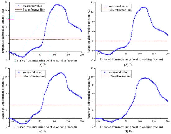 Test points P1, P2, P3, P4, P5, and P6 recorded the expansion deformation of the Ding6 coal seam within a range of 80 m in front and 200 m behind. The expansion deformation of the Ding6 coal seam changes with the advance of the Wu8-31220 working face, as shown in Figure 9. In the figure, negative values on the horizontal axis indicate that the advancing working face has not yet reached the test position; negative values on the vertical axis indicate that the Ding6 coal seam is in a compressed state.