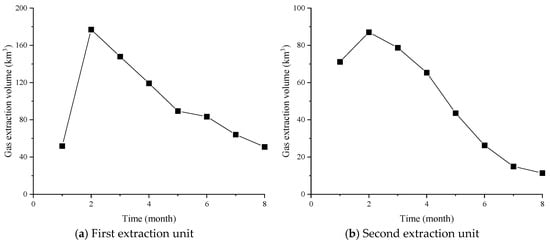 The gas extraction volume of the Ding6-32070 working face shows a certain trend over time, as shown in Figure 10. In the initial three months of gas extraction, the gas extraction volume is relatively high, which is the result of concentrated gas release in the early stage of extraction. However, over time, the gas extraction volume gradually decreases, which is due to the decrease in coal seam expansion and the slowing down of gas release.