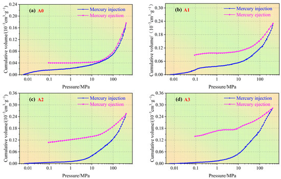MIP was used to analyze the pore structure, morphology, porosity, and connectivity of the coal samples. In this study, the decimal pore size classification method introduced by B.B. Hottot [34] was used to classify pores into four types: micropores (<10 nm), small pores (10–100 nm), medium pores (100–1000 nm), and large pores (>1000 nm). Coal pores can be categorized into four types based on connectivity: through pores, interconnected pores, semi-closed pores, and closed pores. Particularly, through pores and cross-linked pores were typically regarded as open pores. Because mercury cannot penetrate closed pores, the data obtained from MIP can only be used to analyze the characteristics of open and semi-open pores. Owing to the pore shielding effect, mercury injection and ejection curves typically do not overlap, forming a hysteresis loop. This hysteresis behavior can be used to assess the pore morphology of the coal [35,36]. The mercury intrusion equipment used in this paper is the Autopore IV 9510 mercury instrument (produced by the Micromeritics Company, Norcross, GA, USA), with a pore size measurement range of 30 angstroms to 1000 μm. It has two low-pressure stations and one high-pressure station. The volume accuracy for advancing and retreating mercury is below 0.1 μL, and the working pressure ranges from 0.1 to 414 MPa. Figure 2 displays the MIP curves of the coal samples before and after HVEP treatment. At an injection pressure below 10 MPa, the A0 coal sample exhibited slight hysteresis between the mercury injection and ejection curves (Figure 2a). As the injection pressure exceeded 10 MPa, the curves nearly overlapped, indicating the disappearance of the hysteresis loop effect. A pressure of 10 MPa corresponded to a pore diameter of 124.7 nm (calculated using Equation (3) in ref. [10]). This indicates that in bituminous coal, micropores and small pores exhibit relatively poor connectivity and are classified as semi-closed pores. Conversely, medium and large pores display higher connectivity and are considered semi-open pores. However, the overall connectivity of these pores remained low.