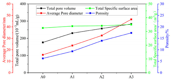 After HVEP treatment, the specific surface areas of A1, A2, and A3 slightly increased compared with A0. This was due to the HVEP-induced formation of larger diameter pores in the coal. However, with increasing pore diameter, the specific surface area decreased, which limited the overall enhancement of the specific surface area. With increasing discharge voltage, the specific surface area exhibited a continuous but gradual increase. As the discharge voltage increased to 12 kV, the specific surface area of the coal sample increased from 32.55 m2/g before HVEP treatment to 35.05 m2/g, reflecting a 7.68% increase. Generally, the gas adsorption capacity of coal is influenced by its specific surface area. Although increasing the specific surface area is theoretically expected to improve gas adsorption capacity, HVEP shock waves opened closed pores, forming numerous interconnected semi-open and open pores that facilitate gas diffusion and migration. Additionally, the repeated oscillating stress waves and continuous friction of internal fluids within the coal reduced pore surface roughness, further promoting gas desorption and migration.