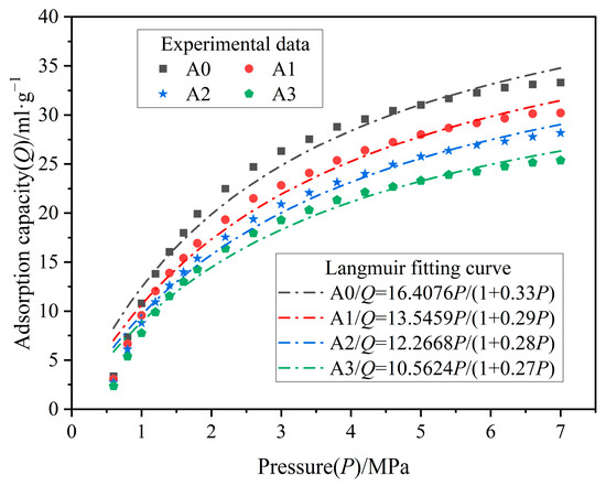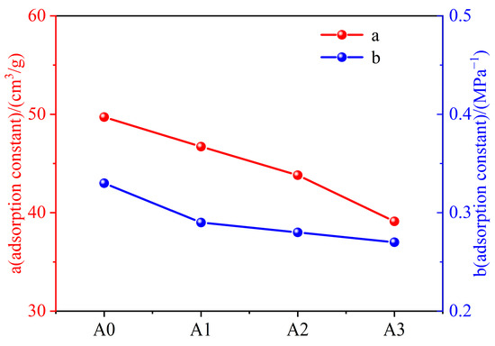 Here, Q denotes the equilibrium pressure gas adsorption volume (cm3/g), a represents the maximum gas adsorption capability (cm3/g), b indicates a constant in the adsorption model that describes the rate of gas adsorption by coal at the low-pressure stage (MPa−1), and P denotes the gas pressure at equilibrium adsorption (MPa).