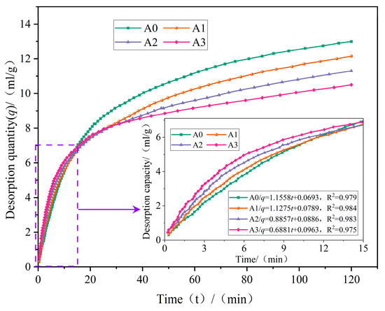 Moreover, the gas desorption capacity increased steadily over time (Figure 6). The shape of the isothermal desorption curve was similar to that of the Langmuir adsorption isotherm. This suggests that the desorption of coal can be described using the Langmuir empirical formula, consistent with previous research findings [42,43]. The expression is as follows: