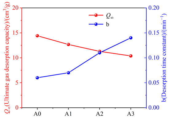 Here, Qt represents the total amount of gas desorbed at a certain point in time (mL/g), Q∞ denotes the final gas desorption quantity as time approaches infinity (mL/g), and b indicates a time constant related to the desorption rate (min−1).