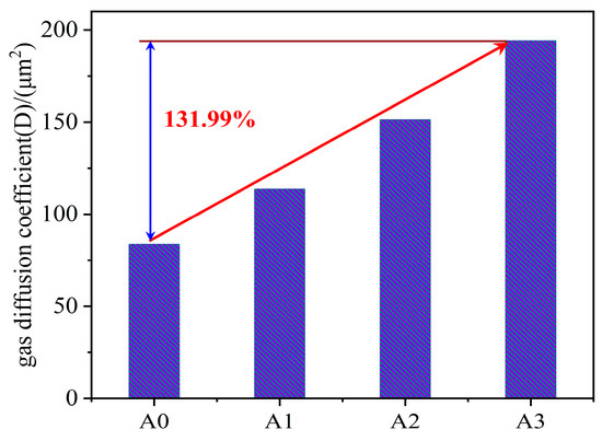 Figure 8 shows the variation in the gas diffusion coefficient (D) of coal samples changes before and after HVEP treatment. After HVEP treatment, the gas diffusion coefficient (D) of the coal samples increased (Table 3 and Figure 8). This increase was due to the creation of new pores and fractures in the coal triggered by the shock waves from HVEPs. These pores were interconnected, forming pore-fracture networks. These networks provided favorable pathways for the unrestricted diffusion of gas within the coal, thereby enhancing the gas diffusion coefficient of the fractured coal samples. With increasing discharge voltage, the gas diffusion coefficient within the fractured coal samples gradually increased (Figure 8). At a discharge voltage of 8 kV, the A1 coal sample had a gas diffusion coefficient of 113.603 μm2·min, reflecting a 35.76% increase. However, at 12 kV, the gas diffusion coefficient for the A3 coal sample increased to 194.32 μm2·min, representing a maximum increase of 131.99%. These findings indicate a reduction in the resistance to gas desorption and free diffusion within the coal body, which facilitated gas migration and the extraction of coal seam gas.