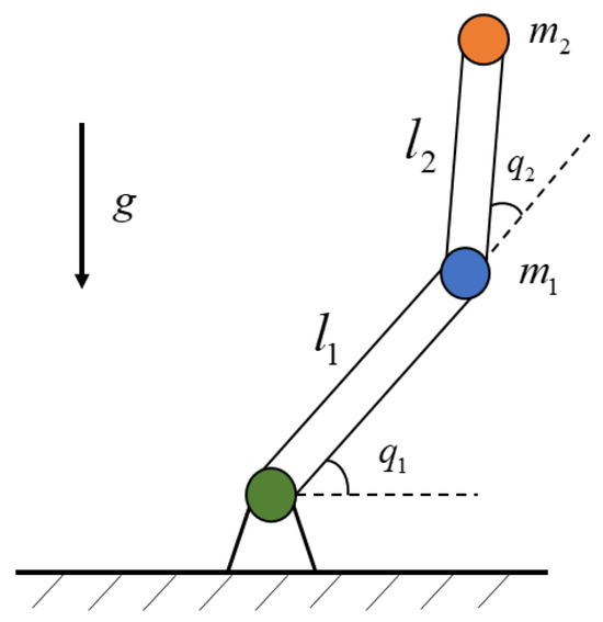 To verify the effectiveness of the above-proposed control strategy, the designed sliding mode control method is applied to the trajectory tracking problem of a 2-DOF rigid body robotic arm, and the simulation object of the robotic arm established is shown in Figure 2.
