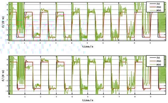 Comparative simulation results are summarized below: the observed values of FDO and NDO for square wave interference are shown in Figure 3, the effects of position tracking and velocity tracking are shown in Figure 4, the positional tracking error is shown in Figure 5, and the controller output torque is shown in Figure 6.