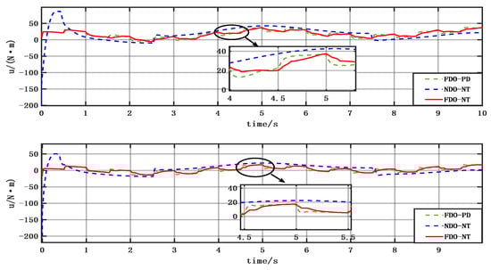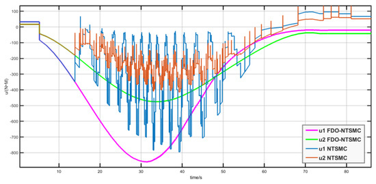 By analyzing the experimental results, it can be seen that the FDO-NTSMC can effectively reduce the mean square error of angle tracking and improve tracking accuracy. The controller outputs of the FDO-NTSMC and NTSMC are shown in the following Figure 11: