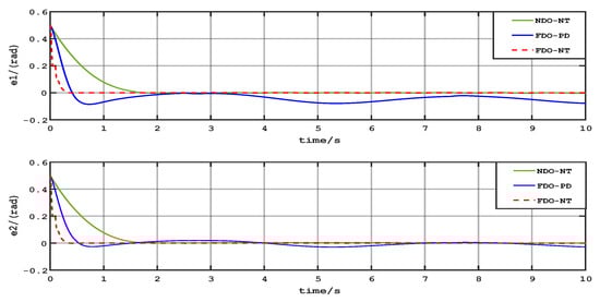where the proportional differential gains are , respectively. The NDO control law is taken as Equation (5), and other parameters remain unchanged.
