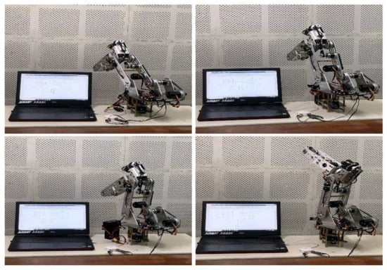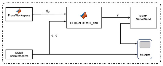 Experimental validation on a physical robotic arm platform confirms the efficacy of the FDO-NTSMC. The experimental platform includes the host computer, the robotic arm body, and the driver. By writing the controller module in the host computer Simulink, the torque value is sent to the driver through the serial port. The driver converts the torque value into the current value and sends it to the joint motor through the CAN bus to drive the robot arm, while joint angles are measured by motor encoders and fed back to the controller at 3 ms intervals. Figure 7 is the system block diagram and the experimental setup is depicted in Figure 8.