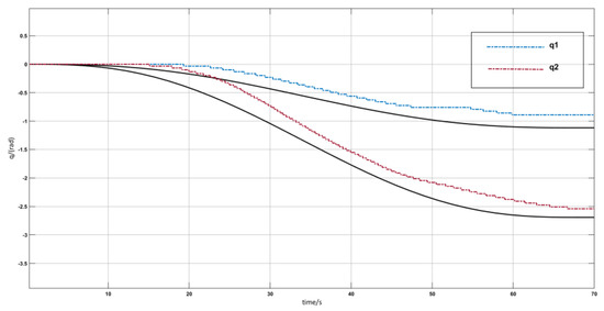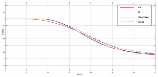 Robotic arm parameters: link masses are 2.5 kg, 2.9 kg, and 1.27 kg and lengths are(118 mm, 220 mm, and 240 mm, respectively, and only the first two joints are used in the experiment. A random initial point within the robotic arm’s workspace defines the desired trajectory. Kinematic inversion and polynomial interpolation generate desired joint trajectories, and the interpolation point information is sent to the controller once every 250 mm. The controller parameter selection is consistent with the simulation experiment, and the initial value of the angle of the two joints is 0. The experiment compares the FDO-NTSMC to the NTSMC and PD controllers and applies a step perturbation during the experiment with a size of 5 Nm and a duration of 0.5 s. The perturbation diagram is shown in Figure 3. In practical applications, high-frequency sampling feedback was implemented, and the physical experiment provided feedback at a frequency of 30 Hz. Figure 9 and Figure 10 present trajectory tracking results and the two joints control performance. The platform exhibits a 10 s startup latency. At 70 s, the trajectory errors of q1 and q2 are 0.227 rad and 0.154 rad, respectively. Take q2 as an example. At 70 s, the errors under the PD, FDO-NTSMC, and NTSMC are 0.097 rad, 0.033 rad, and 0.054 rad, respectively. The error under the FDO-NTSMC is the smallest.