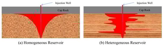 Typical CO2 plumes in homogeneous and heterogeneous reservoirs, showing significant gravity override in a homogeneous reservoir and significant viscous fingering and uneven flow paths in heterogeneous reservoirs [12].
