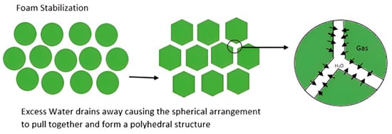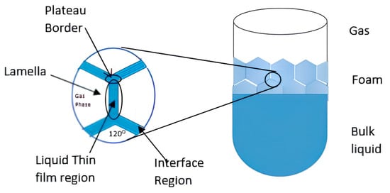 Surface-active agents or surfactants have a major influence on CO2-foam applications by stabilizing foam structures, reducing CO2 mobility, and improving sweep efficiency in enhanced oil recovery (EOR) processes [13]. They are designed to lower the interfacial tension between two phases, such as oil and water, and play a significant role in applications where emulsions need to be stabilized temporarily. Aqueous foams made of carbon dioxide (CO2) are colloidal dispersions made of CO2 bubbles scattered across an ongoing aqueous phase [14]. The gaseous phase is dispersed within the interior phase, while the liquid phase constitutes the external phase. Illustrated in Figure 2 is the progression of foam formation, with the thin fluid sheet denoted as a lamella. A lamella can be segmented into internal gas bubbles within the foam. The “Plateau boundary” designates the region where lamellae intersect, as depicted in Figure 2. The system rapidly stratifies into two layers, with gas bubbles ascending to the surface due to density discrepancies between the medium and the bubbles. Pure liquid cannot produce froth; however, with the introduction of a surface-active substance, foaming occurs. Upon injection beneath the liquid’s surface, a gas bubble invariably ruptures instantaneously. The utilization of a diluted surfactant solution engenders a restoring force, facilitating equilibrium restoration. As the air/liquid interface expands, alterations in surface equilibrium prompt the development of a polyhedral structure, as depicted in Figure 3 [15].