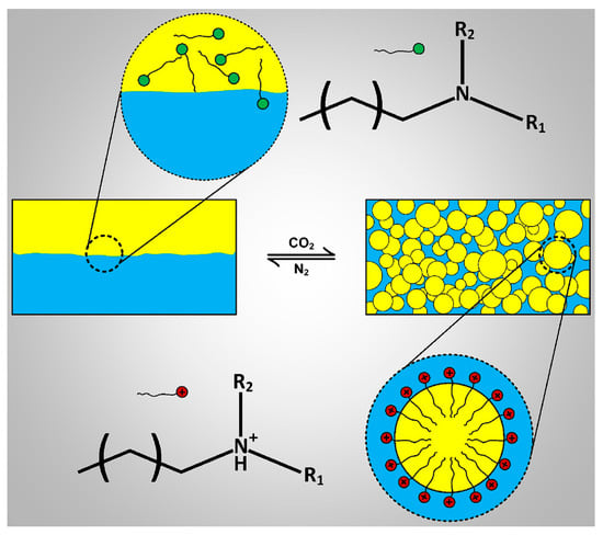Switchable surfactants are a class of amphiphilic molecules that can undergo reversible interconversions between active and inactive forms. These surfactants can be switched on or off, allowing for the controlled stabilization or destabilization of emulsions at specific desired stages of a process [23]. Switchable surfactants offer advantages such as delayed activity until needed, reusability, and facilitated removal from the product stream by switching to the form least soluble in the relevant medium [24]. The transformation of switchable surfactants is triggered by benign gases like carbon dioxide and air [25]. CO2 is an advantageous trigger that is inexpensive, nonhazardous, non-accumulating in the system, and easily removed, and it does not require the material to be transparent [26]. Typically, CO2-switchable surfactants contain functional groups that can be reversibly protonated or deprotonated in the presence of CO2, leading to alterations in their molecular structure and surface affinity [24,25]. When CO2 is present, these surfactants undergo a chemical transformation, causing a shift in their hydrophilic–hydrophobic balance. In their activated state, CO2-triggered switchable surfactants exhibit enhanced hydrophobicity, reducing their solubility in aqueous environments and diminishing their surface activity. Conversely, in the absence of CO2, they revert to their original hydrophilic state, thereby restoring their surface activity and solubility [24,27]. This reversible switching mechanism enables precise control over the interfacial properties of the system, making CO2-triggered switchable surfactants valuable for applications such as CO2 capture and utilization, emulsion stabilization, and controlled release systems, where dynamic modulation of surfactant behavior is desired. Figure 4 demonstrates the switchability.