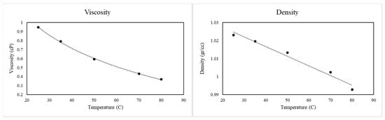 Viscosity and density of the brine at different temperatures and atmospheric pressure were measured by Anton Paar AMV 200 and DMA 4100, Ostfildern-Scharnhausen, Germany, respectively, and are reported in Figure 5.