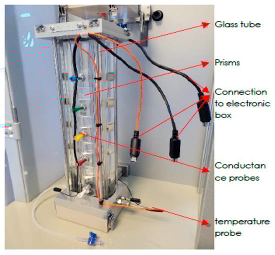 The FoamScanTM Cylindrical Double-Walled Jacket by Teclis Scientific, Rhône, France, was used to investigate foam generation, stability, bubble size, and bubble distribution under controlled conditions. Through a porous distributor filter, CO2 or N2 gas is introduced into a surfactant solution to generate foam. FoamScan™ was set on fixed parameters to reduce errors and to obtain comparable results. A 60 mL surfactant solution was injected into the 240 mL testing tube using a disposable syringe, providing sufficient space for foam expansion. The system operated under 1 bar pressure, with temperatures ranging from 22 °C to 77 °C, using a double-walled glass cylinder to ensure uniform heating and controlled environmental conditions. The flow rate was fixed at 220 mL per minute, and the pressure was constant at 1 bar. The foam-generating procedure is set to generate foam until 100 mL or 120 s of generating, and then bubbling stops, and stability is evaluated. The foam column is shown in Figure 7.