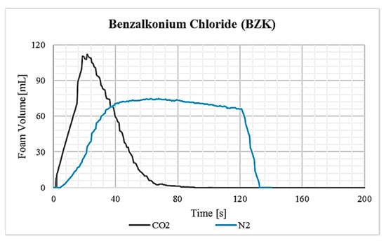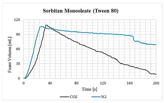 Figure 8 demonstrates the behavior of Tween 80 when subjected to alternating CO2 and N2 injections. The chart clearly shows minimal differences between the gas alternations, indicating that this surfactant is not CO2-switchable. This behavior is typical for standard, non-switchable surfactants. As expected, the maximum foam volume remains nearly constant at approximately 102 mL. This is also demonstrated in other studies where Tween 80 foam is found to be unstable even at higher concentrations [43].