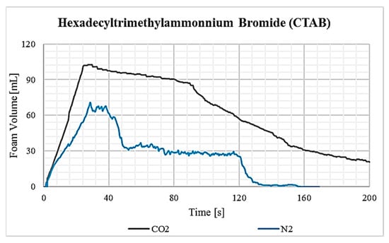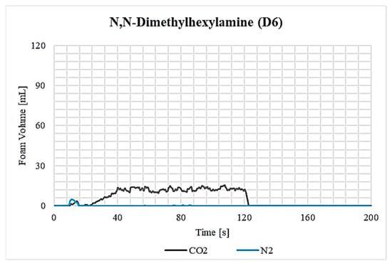 D6 and D10 are tertiary amine-based surfactants with shorter tail lengths. D6, with its shorter hexyl (-C6H13) tail, mainly relies on the protonation–deprotonation of its -N (CH3)2 headgroup for CO2/N2 switching. Figure 11 shows that D6 exhibits almost no response to CO2/N2 phases, generating only a few milliliters of foam in CO2, and none in N2. In contrast, D10, with its longer decyl (-C10H21) tail, demonstrates stronger hydrophobic interactions and a higher responsiveness to CO2, as shown in Figure 12. More foam volume is observed with D10, although there is no notable responsiveness to N2.