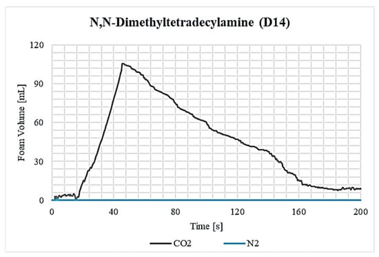 N,N-Dimethyltetradecylamine (D14) is a surfactant with a medium-length tetradecyl (-C14H29) tail, which is more hydrophobic than both D6 and D10. Figure 13 demonstrates its CO2/N2 responsiveness, which arises from both headgroup protonation and hydrophobic interactions with CO2. This results in a significantly higher foam volume compared to surfactants with shorter tails. The longer hydrophobic tail of D14 enhances its affinity for CO2, as CO2 preferentially dissolves in nonpolar regions, disrupting molecular packing and influencing self-assembly behavior.